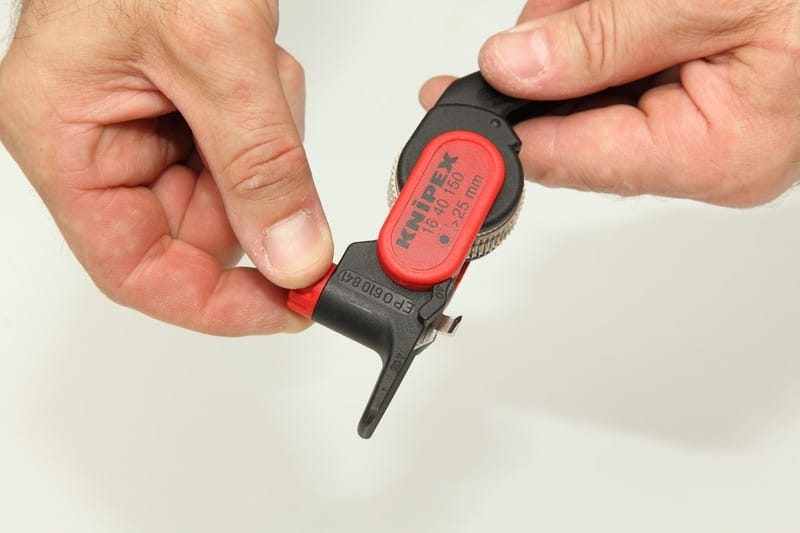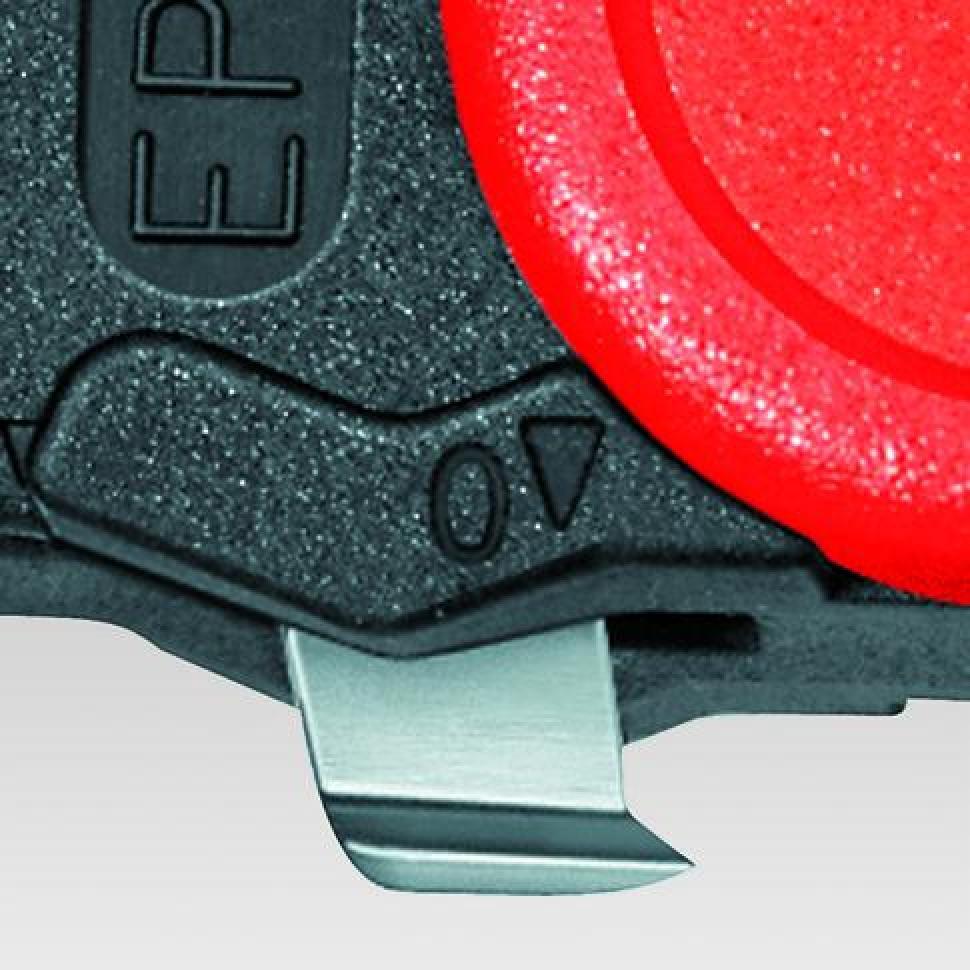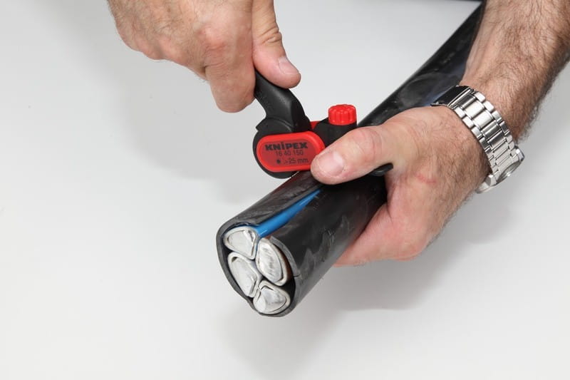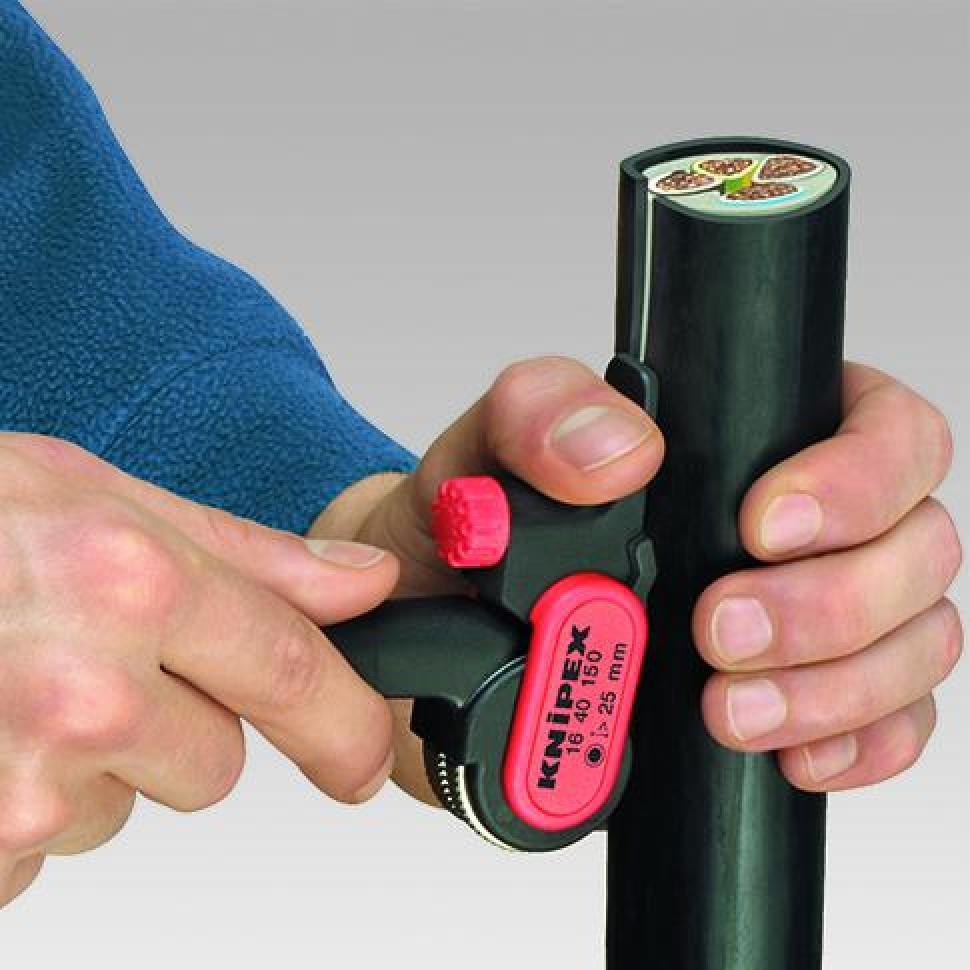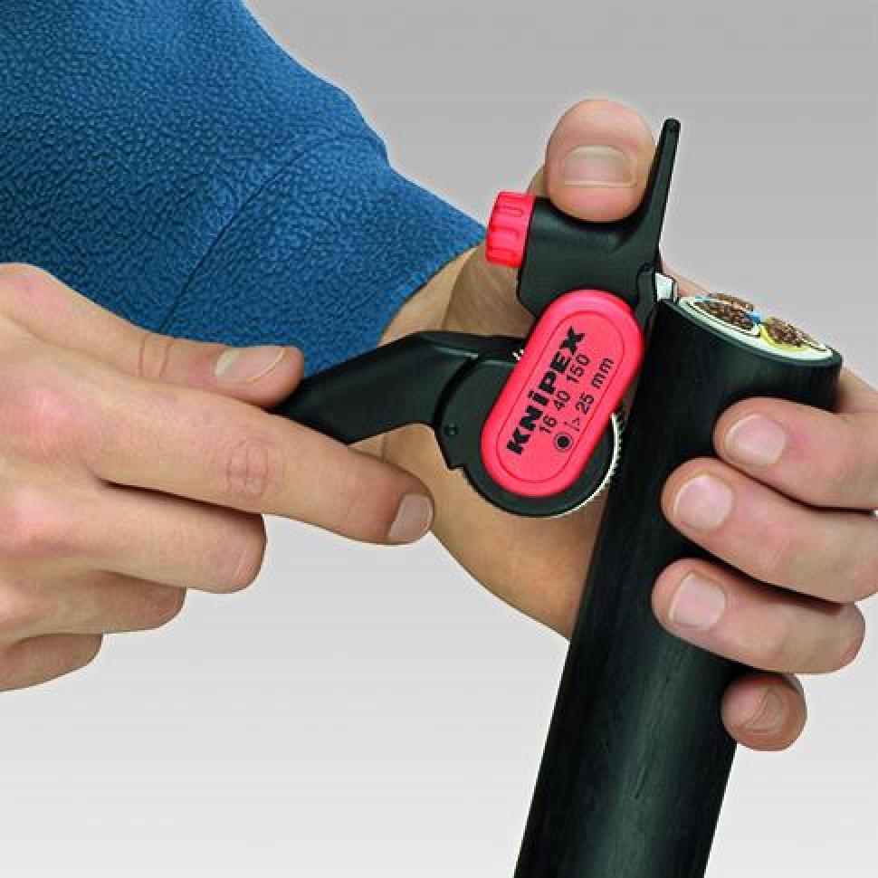 Profesjonalny przyrząd (ściągacz) firmy Knipex do zdejmowania izolacji z kabli i przewodów okrągłych jedno lub wielożyłowych średnicy powyżej 25 mm. Ściągacz usuwa izolację ze wszystkich standardowych przewodów. Korpus ściągacza wykonany z tworzywa sztucznego wzmocnionego włóknem szklanym. Ściągacz izolacji odpowiedni do cięcia wzdłużnego oraz po obwodzie. Regulacja głębokości cięcia do 5 mm. Wymienny nóż z dwustronnym ostrzem, wykonany ze specjalnej stali nożowej wysokiej jakości. Ściągacz izolacji przydatny podczas prac montażowych np. przy urządzeniach energetycznych, kablach zasilających itp.