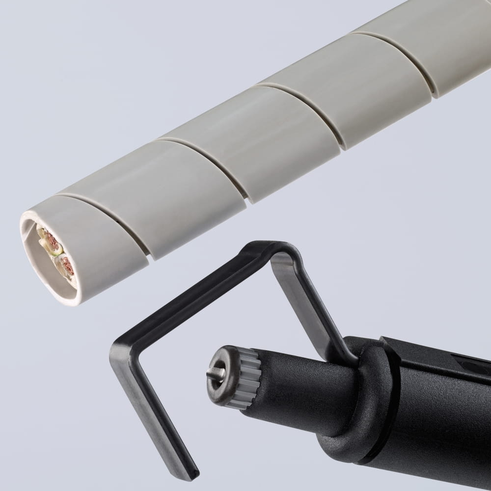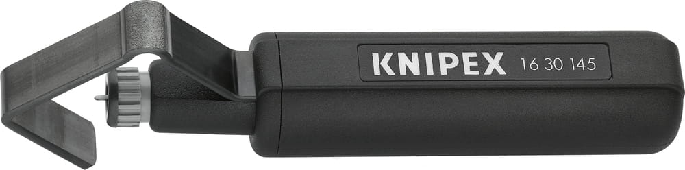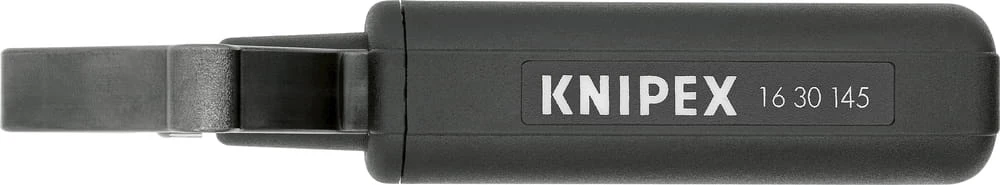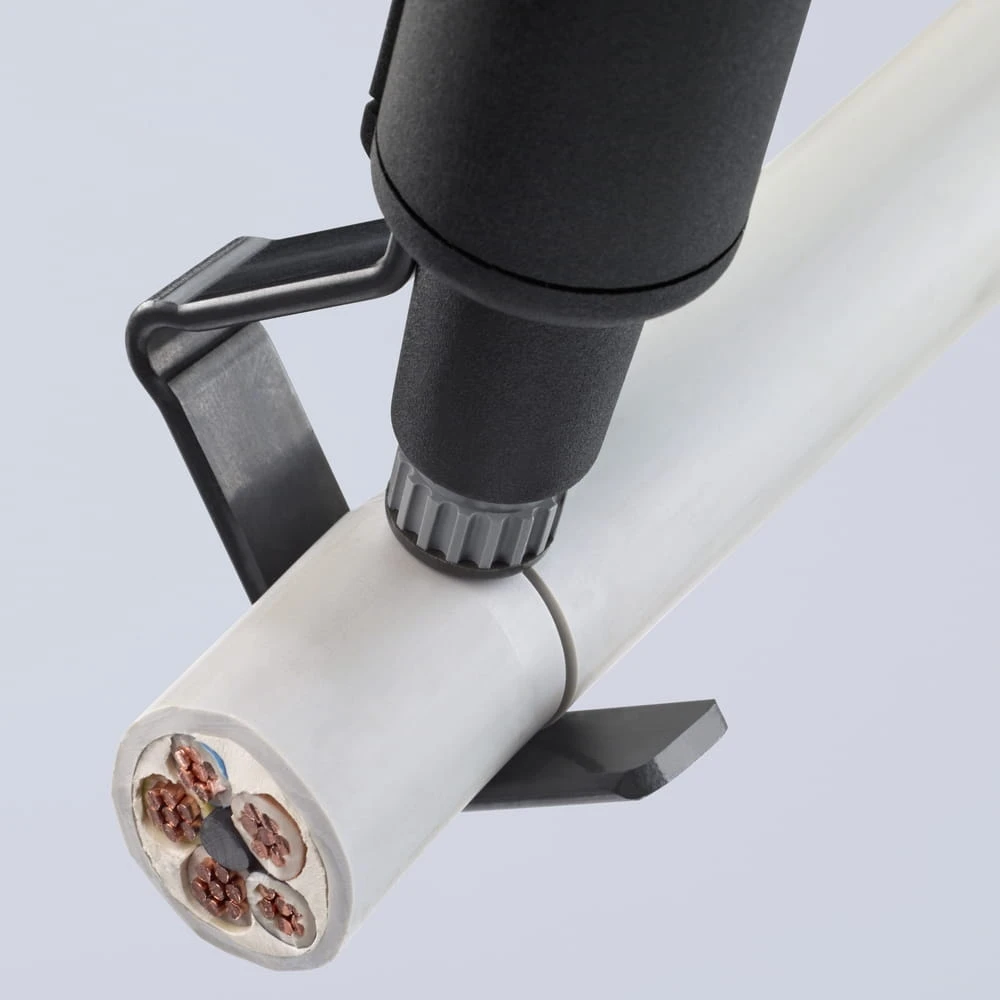 Profesjonalny przyrząd (ściągacz) firmy Knipex do zdejmowania izolacji wykonanych z tworzywa z kabli i przewodów okrągłych jedno lub wielożyłowych przydatny podczas prac montażowych np. w szafach sterowniczych. Obrotowy nóż z regulacją głębokości do cięcia wzdłużnego i po obwodzie.