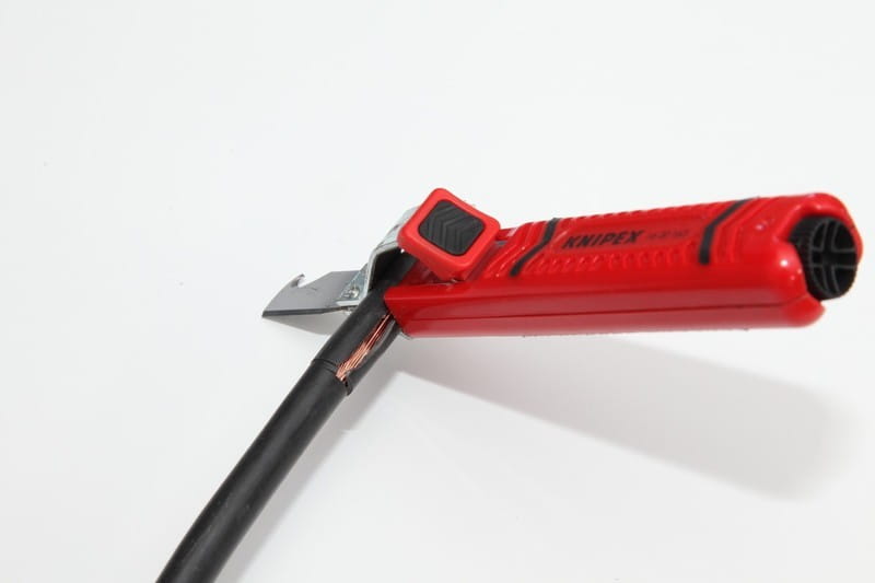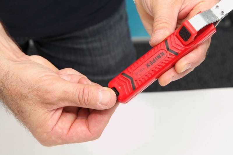 Profesjonalny przyrząd (ściągacz) firmy Knipex do zdejmowania izolacji wykonanych z tworzywa z kabli i przewodów okrągłych jedno lub wielożyłowych, z ostrzem skalpela. Ostrze w kształcie haka, z nasadką ochronną z tworzywa sztucznego. Do ściągania izolacji z wszystkich ogólnie stosowanych przewodów okrągłych. Samonapinający element obejmujący przewód. Z pokrętłem regulującym głębokość nacinania izolacji. Obrotowy wewnętrzny nóż do cięcia wzdłużnego i po obwodzie. Zapasowe ostrze wewnątrz rękojeści. Miękkie wkładki na rękojeści i elemencie obejmującym zapewniają pewny chwyt. Korpus ściągacza izolacji został wykonany z tworzywa sztucznego, odporna na uderzenia. Ściągacz izolacji jest bardzo przydatny podczas prac montażowych np. w szafach sterowniczych.