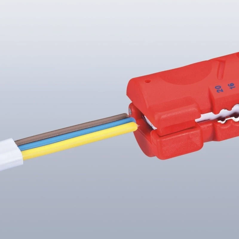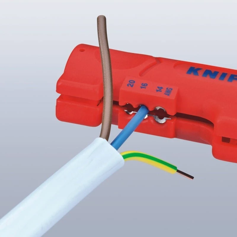 - profesjonalny przyrząd (ściągacz) firmy Knipex do usuwania izolacji zewnętrznej z przewodów płaskich o szerokości 12 mm oraz przewodów okrągłych wodoodpornych Ø 4,0 - 13,0 mm (np. 3 x 1,5 mm2 lub 5 x 2,5 mm2)