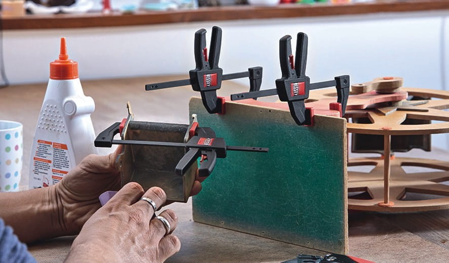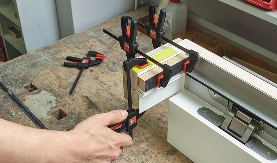 - dwukomponentowa rękojeści z tworzywa sztucznego z dźwignią zamykającą umieszczoną za szyną, pozwala na wygodny chwyt i wytworzenie dużej siły podczas mocowania