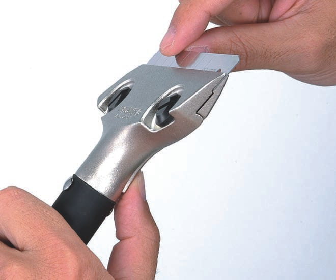 Uniwersalny skrobak z bardzo twardym wymiennym ostrzem firmy Tajima. Głowica skrobaka wykonana z odlewanego ciśnieniowo aluminium z wzmocnionym trzonem. Z przelotowym trzpieniem i kołpakiem do pobijania, z wymiennym ostrzem segmentowym 18 x 100 mm. Bardzo łatwa wymiana ostrza przez naciśnięcie przycisku. Ergonomiczna rękojeść z tworzywa. Dodatkowo posiada ochrone na ostrza. Skrobak uniwersalny dostarczany jest z trzema ostrzami zapasowymi. Doskonale sprawdzi się do wszelkiego rodzaju prac budowlanych i dekoracyjnych np. zdzierania tapety, starych wykładzin itp.