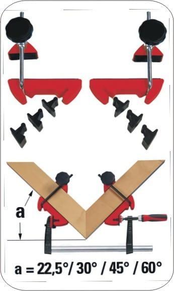 - dodatkowe szczęki Bessey umożliwiające klejenie elementów pod kątem przy użyciu dowolnego ścisku (zacisku) żeliwnego lub stalowego