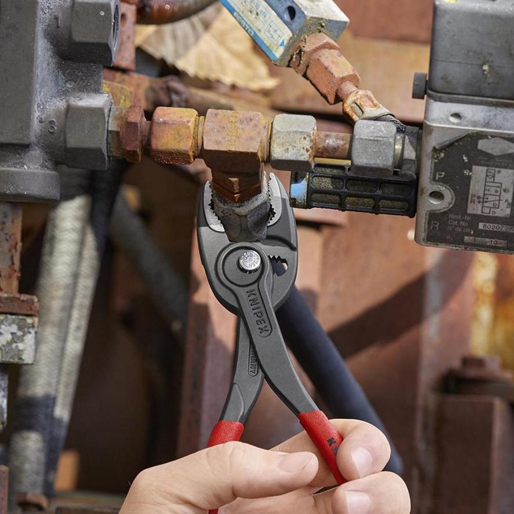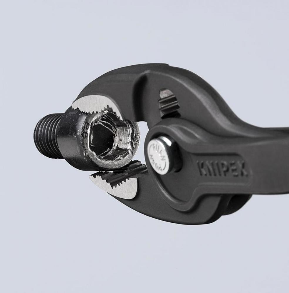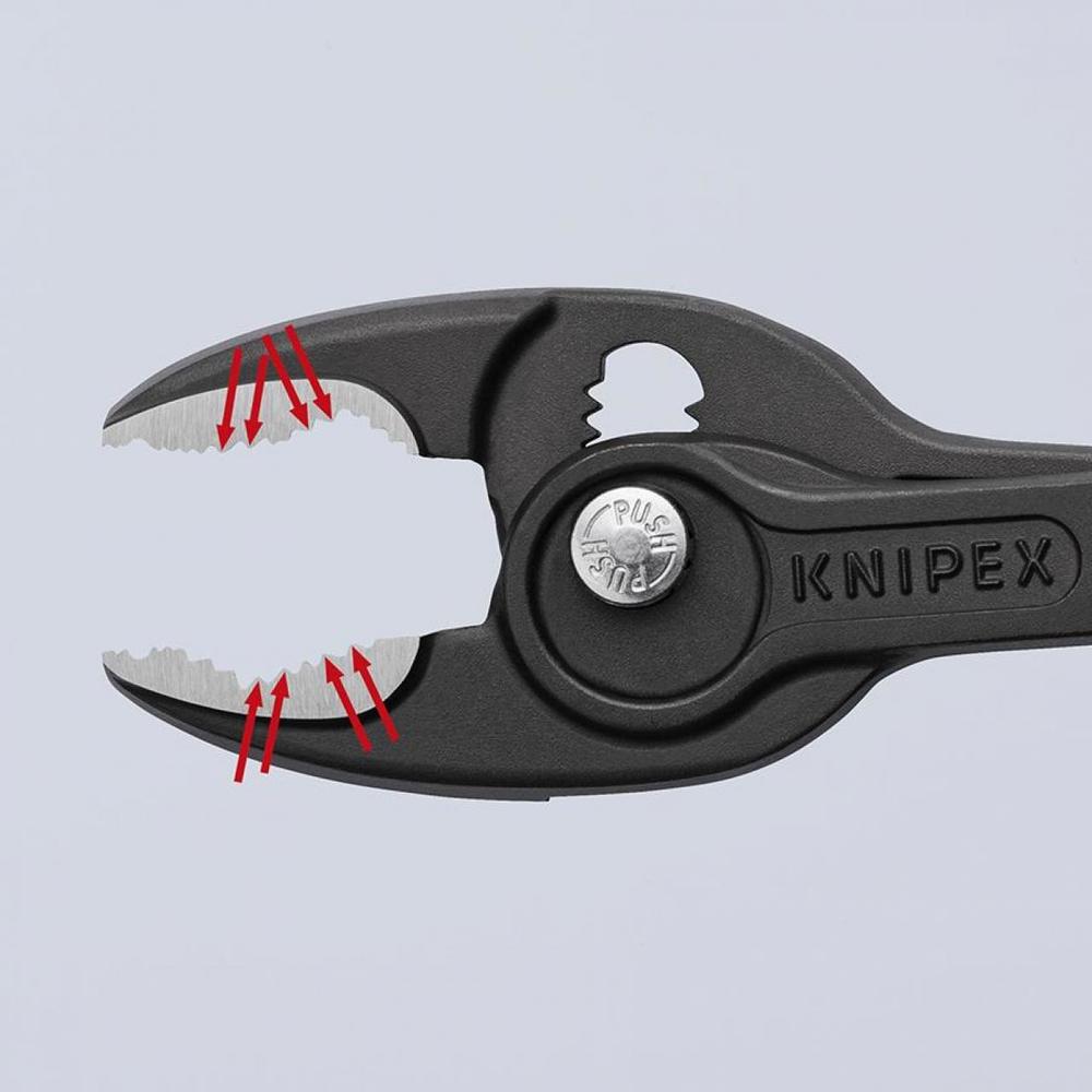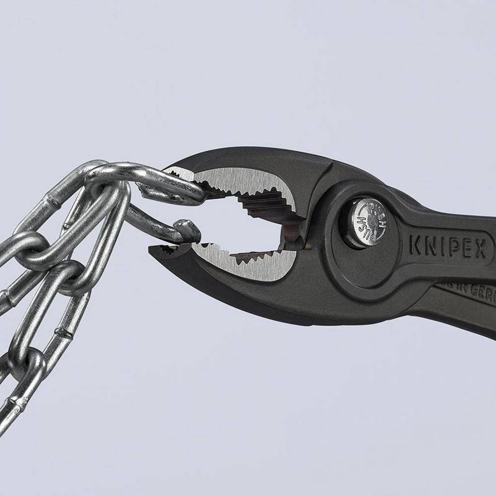 Profesjonalne, uniwersalne narzędzie, które doskonale poradzi sobie z zapieczonymi detalami, takimi jak śruby czy wkręty - idealne do szpilek. Szczypce do śrub i nakrętek TwinGrip to unikalne połączenie funkcji chwytu od czoła i z boku, złącze wsuwakowe, regulacja przyciskiem. Bardzo smukłe szczypce pozwalają na pracę nawet w ograniczonych przestrzeniach, z niewielką strefą obrotu umożliwiającą szybką pracę. Mocno trzymająca przednia część szczęk z solidnymi zębami i wysokim przełożeniu na końcówkach szczęk. Duży zakres chwytu od czoła i z boku dla średnicy i rozmiarów klucza 4 - 22 mm. Trzy punkty przyłożenia zapewniają pewny, czołowy chwyt płaskich elementów. Szczypce do śrub i nakrętek umożliwiają chwytanie, dokręcanie i luzowanie śrub ze zużytymi łbami i profilami. Pięciostopniowo regulowane złącze ślizgowe z przyciskiem do precyzyjnego ustawienia szerokości chwytu. Zabezpieczenie przed przyciśnięciem palców zmniejsza ryzyko urazów. Złącze wsuwkowe jest solidne, trwałe, wytrzymałe i równocześnie elastyczne umożliwiając pewny chwyt przedmiotów. Wykonane ze stali elektrycznej chromowo - wanadowej, hartowane olejowo, zęby dodatkowo hartowane indukcyjnie do ok. 61 HRc. Rękojeści szczypiec do śrub i nakrętek są powlekane antypoślizgowym tworzywem sztucznym.