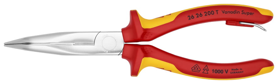 Szczypce półokrągłe (telefoniczne) wydłużone wygięte, z uchwytem do linki zabezpieczającej Knipex 26 26 200 T