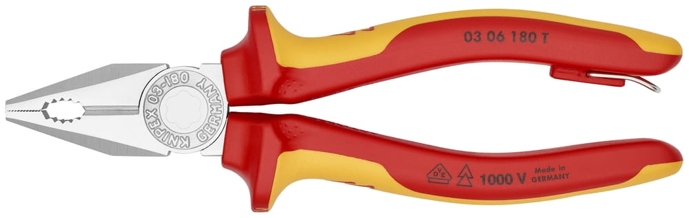 Szczypce uniwersalne (kombinerki), izolowane z uchwytem do linki zabezpieczającej Knipex 03 06 180 T
