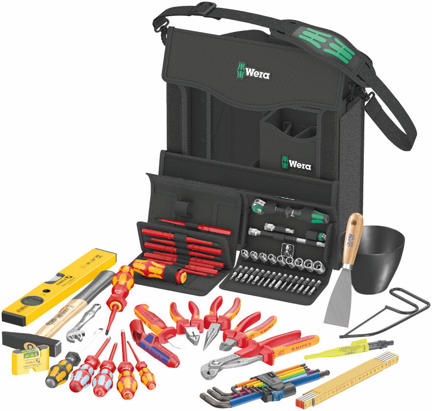 Zestaw profesjonalnych narzędzi dla elektryków. Zestaw składa się z markowych narzędzi takich jak:Wera, Jung, KNIPEX®, Lyra®, PICARD®, PUK® i Stabila®. W skład narzędzi wchodzi: Wera Kraftform Kompakt Turbo i 1 (16-częściowy zestaw złożony z rękojeści i trzpieni wymiennych VDE) 4-krotnie zwiększający prędkość pracy i zestaw z grzechotką Wera 8100 SA 6 Zyklop Speed (1/4", 28-częściowy). Samonastawny klucz płaski Joker 6004 S do nakrętek i śrub 10-13 mm (metrycznych) lub 7/16"-1/2" (calowych) Z wkrętakiem do pobijania, wkręcania i dłutowania oraz 4 wkrętakami VDE, w tym 2 z trzpieniem ze stali nierdzewnej zapobiegającej powstawaniu korozji nalotowej na przedmiotach ze stali nierdzewnej. Wszystkie narzędzia w wygodnym, trzymałym tekstylnym neseserze, który oferuje wiele korzyści do przechowywania i transportu narzędzi.Tekstylny neseser zapewnia szczególną ochronę narzędzi przed kurzem i wilgocią oraz chroni narzędzia podczas transportu.