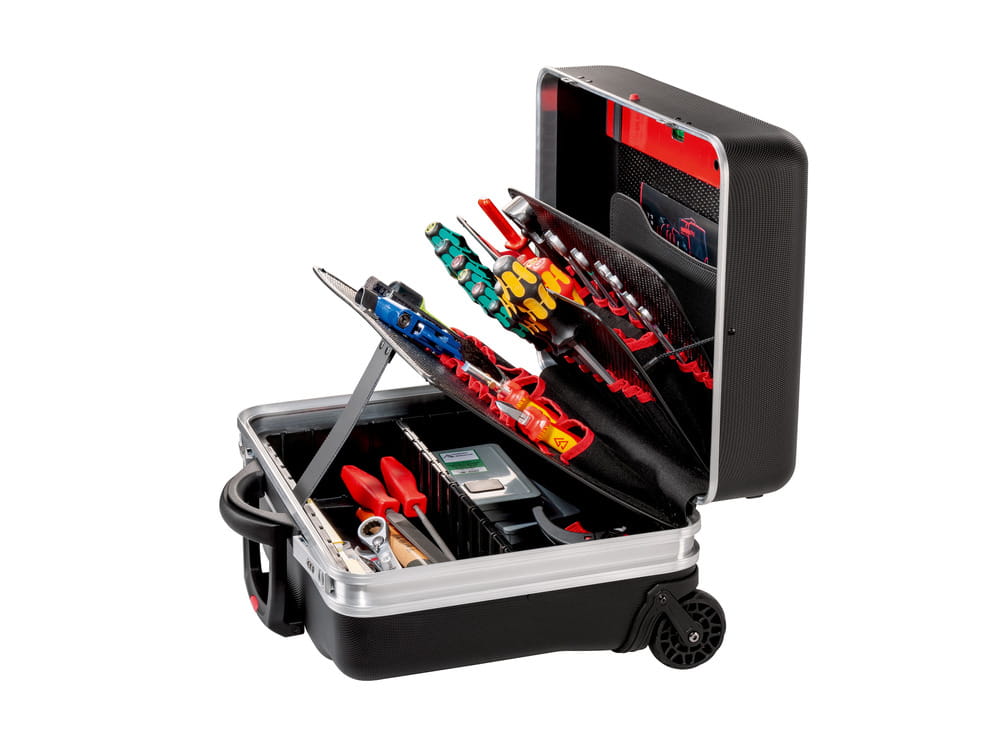 - swoboda ruchu i wygoda w transporcie – wyjątkowo wytrzymałe, łożyskowe kółka i czterostopniowa teleskopowa rękojeść czynią transport walizki płynny i bezwysiłkowy.Twoje narzędzia zawsze podążają za Tobą!