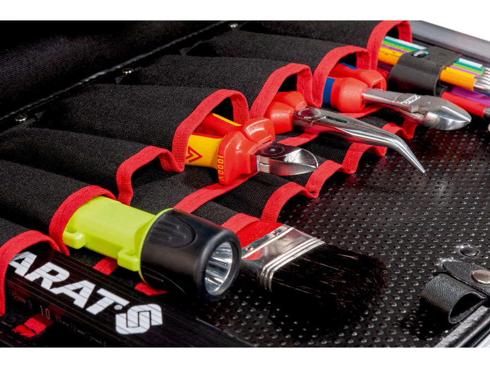 Walizka narzędziowa Parat Classic King Size Roll oferuje przestrzeń, która jest w stanie pomieścić do 50 narzędzi. Z wypinaną deską narzędziową z 25 szytymi przegródkami i drugą deską z 10 przegródkami, każde narzędzie ma swój wyznaczony kącik – wygodne przechowywanie, szybki dostęp i żadnych nerwów. A jeśli chcesz mieć zawsze przy sobie dokumenty? Przegroda na dokumenty o szerokości 400 mm ma Cię na oku! Są też przemyślane uchwyty na poziomice, kieszenie na wizytówki i etui na ołówki, bo przecież diabeł tkwi w szczegółach