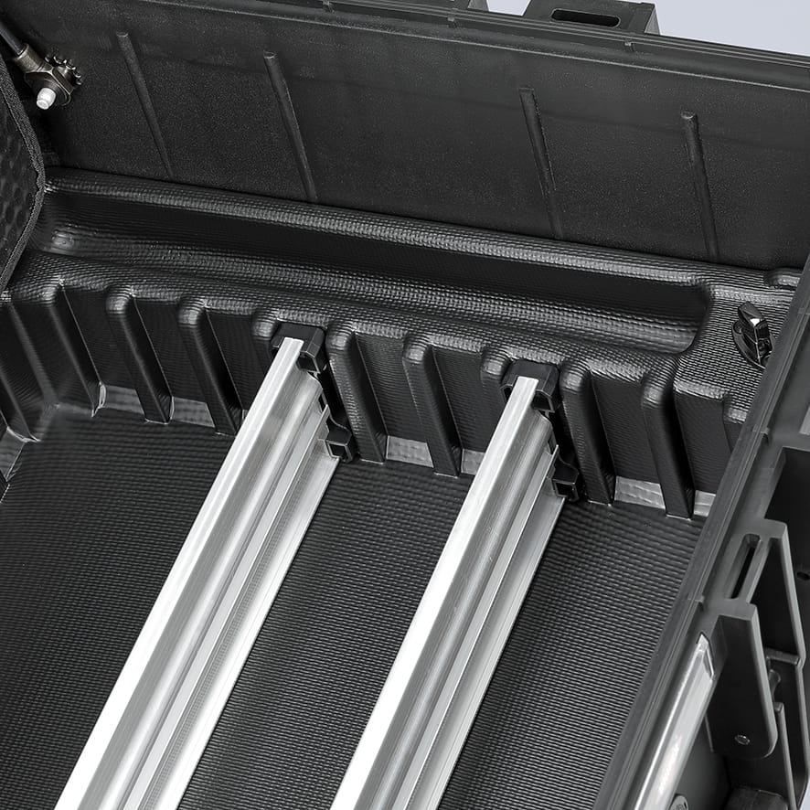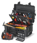 Walizka na narzędzia Knipex, z odpornego na uderzenia polipropylenu, pyło i wodoszczelna z rozbudowanym wyposażeniem - 63 markowe narzędzia, częściowo przetestowane przez VDE zgodnie z normą DIN EN 6090. Posiada kieszeń na dokumenty; ścianki wewnętrzne z 54 kieszonkami i 94 uchwytami z taśmy na narzędzia, oraz zamykany pojemnik dolny z systemem przegródek aluminiowych do dowolnej aranżacji przestrzeni, łącznie 147 opcji ustawień. Walizka narzędziowa Knipex z zaworem automatycznego wyrównania ciśnienia. Z zamkiem przystosowanym do zamknięcia na kłódkę. Ergonomiczna rękojeść dwukomponentowa. Walizka narzędziowa Knipex z dwoma kółkami i z teleskopową rękojeścią. Odporna na temperaturę w zakresie od - 30°C do + 80°C. Walizka narzędziowa Knipex odpowiednia do przewozu samolotem. Doskonale nadaje się do prac serwisowych i warsztatowych. Pojemność 45 l, max. udźwig 35 kg. Wymiary zewnętrzne (S x W x G): 609 x 428 x 263 mm; wymiary wewnętrzne (S x W x G): 540 x 364 x 229 mm.