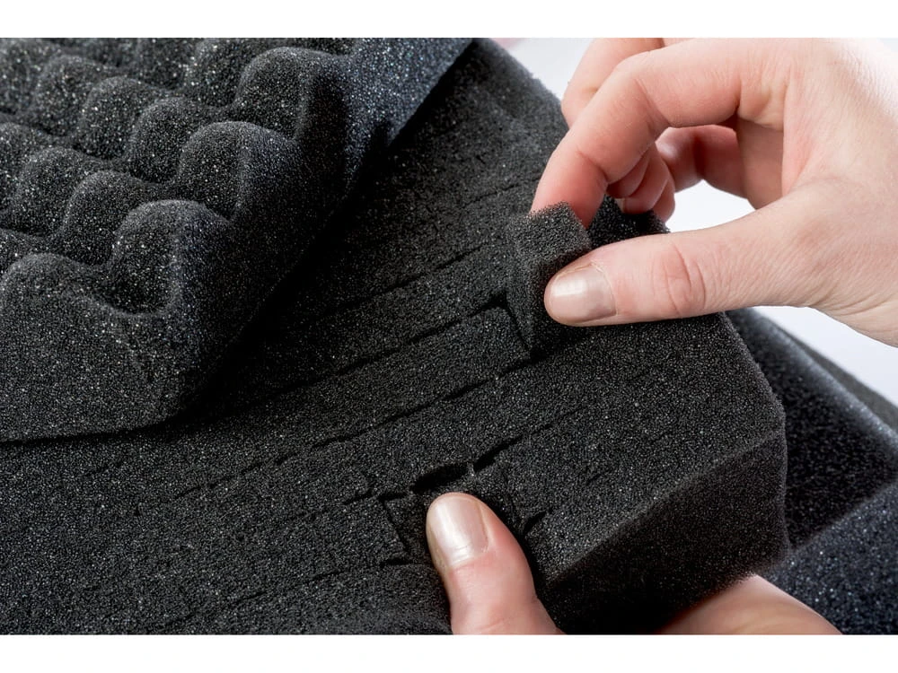 Wnętrze tej fortecy to mistrzostwo organizacji i bezpieczeństwa – a wszystko to dzięki pełnemu zestawowi czterech pianek ochronnych. Na spodzie znajduje się warstwa pianki o wysokości 10 mm, która amortyzuje narzędzia od dołu. Środkową przestrzeń wypełniają dwie warstwy siatki piankowej, każda o wysokości 50 mm, które możesz dowolnie dopasować do kształtu i rozmiaru swojego sprzętu. Całość od góry zabezpiecza pianka z wypustkami umieszczona w pokrywie, która delikatnie, ale skutecznie dociska narzędzia, eliminując wszelkie przesunięcia. Taki układ to gwarancja, że wszystko pozostaje na swoim miejscu – bezpieczne, stabilne i gotowe do użycia.