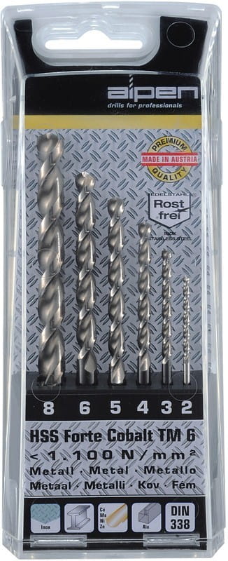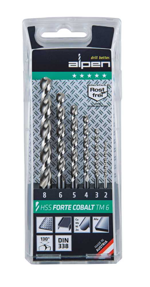 Zestaw 6 szt. wysokiej klasy profesjonalnych wierteł spiralnych, szlifowanych, firmy Alpen z 5% dodatkiem kobaltu. Polecane do pracy w maszynie stacjonarnej, również do pracy w trudnych warunkach np. podczas słabego odprowadzania wiórów, wiercenia głębokich otworów itp. Do wiercenia otworów w: stali automatowej (do 850 N/mm²) stali stopowej (do 1300 N/mm²) i niestopowej (do 1100 N/mm²), stali nierdzewnej i kwasoodpornej o wysokiej twardości, żeliwie szarym i ciągliwym, stopach mosiądzu, miedzi, stopach aluminium dających krótkie wióry oraz tworzywach sztucznych. Precyzyjnie wykonane i ostrzone, szybkie dzięki spirali o odpowiednim kształcie. Dzięki specjalnemu procesowi szlifowania wiercą szybko, głęboko i podczas pracy wymagają ok 50% mniej siły w stosunku do tradycyjnych wierteł. Głębokość wiercenia do 8xD (głębokość = 8 x średnica). Do pracy w temperaturze do 600º C. Samocentrujące, szlif stożkowy "split point" (od fi 2,0 mm), kąt ostrza 130º. Wiertła wykonane z wysokogatunkowej stali szybkotnącej HSS z 5% dodatkiem kobaltu. Zapakowane w kasecie z tworzywa. Są to zdecydowanie najlepsze wiertła do stali nierdzewnej na rynku europejskim.