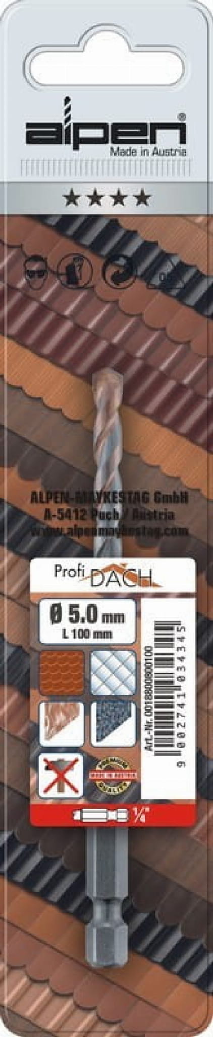 Wiertło do dachówki Alpen Profi Dach to wyjątkowo profesjonalne narzędzie dedykowane do wiercenia w najtwardszych dachówkach na świecie. Jest to możliwe ponieważ ostrze wiertła wykonane z płytki widiowej z węglika wolframu (z dodatkiem kobaltu). Ostrze ma dwie bardzo ostre krawędzie tnące, specjalnie uformowane o wybitnej twardości, które są ostrzone i szlifowane diamentem. Pozwala to na szybkie wiercenie bez udaru we wszystkich rodzajach dachówek bez obawy ich uszkodzenia. Spirala wiertła jest odpowiedniego kształtu, twardości i elastyczności odporna na pękanie i wycieranie. Ostrze jest stopione ze spiralą. Mocowanie wiertła jest szybkie i bardzo wygodne, ponieważ wyposażono je w chwyt 1/4". Zakończenie to umożliwia współpracę ze wszystkimi końcówkami magnetycznymi czy też zatrzaskowymi mocowanymi głównie we wkrętarkach.