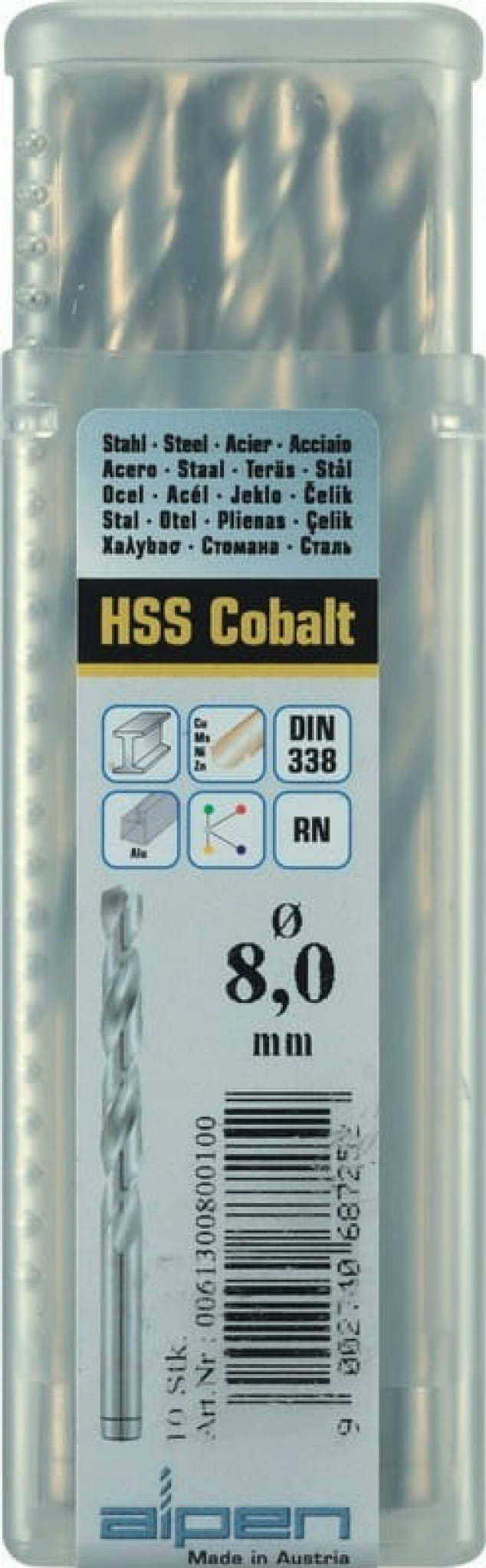 Profesjonalne wiertło do metalu HSS Co firmy Alpen, to bardzo wydajne i szybkie narzędzie do wiercenia w: stali nierdzewnej i kwasoodpornej, stali stopowej (do 1300 N/mm2) i niestopowej (do 1100 N/mm²), stali automatowej (do 850 N/mm²), żeliwa szarego i ciągliwego, stopów mosiądzu, miedzi i aluminium, tworzyw sztucznych wszelkiego typu oraz drewna i materiałów drewnopochodnych. Wykonane jest z wysokogatunkowej stali szybkotnącej HSS z 5% dodatkiem kobaltu, głębokość wiercenia nieprzelotowego to 5xD (głębokość = 5 x średnica). Precyzyjnie wykonane i ostrzone wymaga użycia ok 50% mniej siły w stosunku do tradycyjnych wierteł. Wiertło jest samocentrujące, szlif stożkowy "split point" (od fi 2,0 mm), kąt ostrza 130º, temperatura do 600º C. Polecane do pracy w maszynie stacjonarnej lub do pracy "z ręki", stosowanie chłodziwa zwiększa żywotność wiertła.