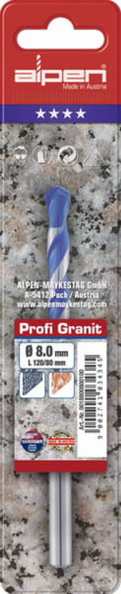 Wiertło udarowe do granitu i marmuru firmy Alpen Profi Granit to wysoce profesjonalne narzędzie do wiercenia w twardym i najtwardszym granicie, cennym marmurze, a także w różnorodnych okładzinach z kamienia naturalnego. Ostrze wiertła to płytka widiowa z węglika wolframu, posiada dwie bardzo ostre krawędzie tnące, które są ostrzone i szlifowane diamentem. Pozwala to na wiercenie bez udaru w cienkich i twardych płytach bez obawy ich pęknięcia. W materiałach grubszych można wiercić (nie trzeba) z udarem głównie ze względu na szybkość tej operacji. Otwory wywiercone przez wiertło Profi Granit spełniają normę jakości PGM wymagającej wykonania otworów z dużą dokładnością. Niebieska spirala umożliwia szybkie usuwanie pyłów z otworu, jest ona odpowiedniej twardości i elastyczności, odporna na pękanie i wycieranie. Wiertło jest niezbędne przy wszystkich pracach związanych z obróbką kamienia.