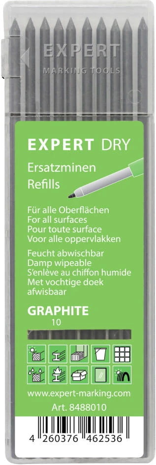 Wymienne wkłady do ołówka automatycznego EXPERT DRY. Zestaw zawiera 10 wkładów grafitowych. Przeznaczone są do znakowania większości powierzchni - suchych, wilgotnych, szorstkich, pokrytych pyłem, a nawet tłustych. Umożliwia pisanie na wielu materiałach takich jak: metal, plastik, ceramika, drewno, kamień, guma. Wkłady dokonale sprawdzą się w pracach budowlanych, stolarskich, warsztatowych. Wykonane oznaczenia za pomocą rysika z łatwością zmyjemy na mokro. Wygodne opakowanie zabezpieczające wkłady do ołówka automatycznego przed złamaniem.