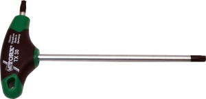 Wkrętak (śrubokręt) warsztatowy trzpieniowy typu "T" firmy Montero. Pracuje się nim przy śrubach i wkrętach z gniazdem Torx® (TX) stosowanych np. w urządzeniach, maszynach, samochodach, sprzęcie elektronicznym itp. Sprawdzi się przy wszelkiego rodzaju przemysłowych i warsztatowch pracach montażowych oraz serwisowych. Dwukomponentowa rękojeść "T" umożliwia przeniesienie dużego momentu obrotowego. Wkrętak wyposażony został w dodatkowy trzpień boczny. Wykonany ze stali chromowo-wanadowej, niklowany.