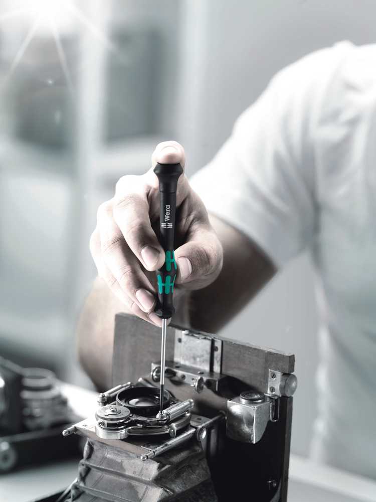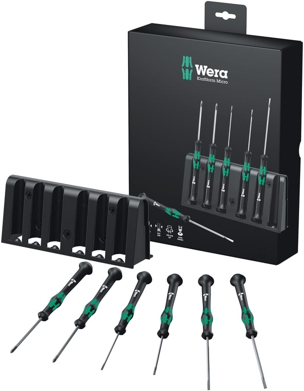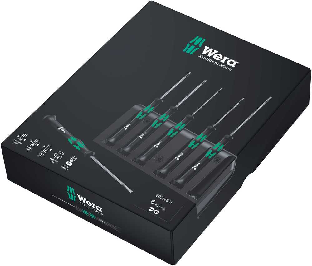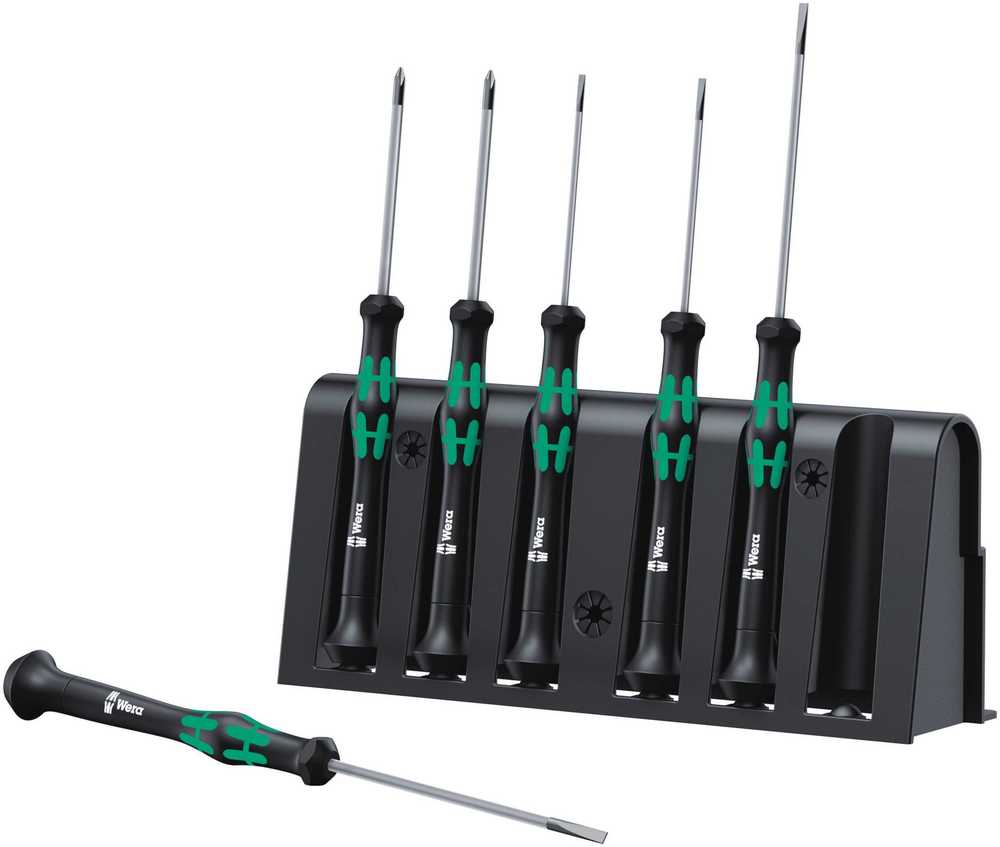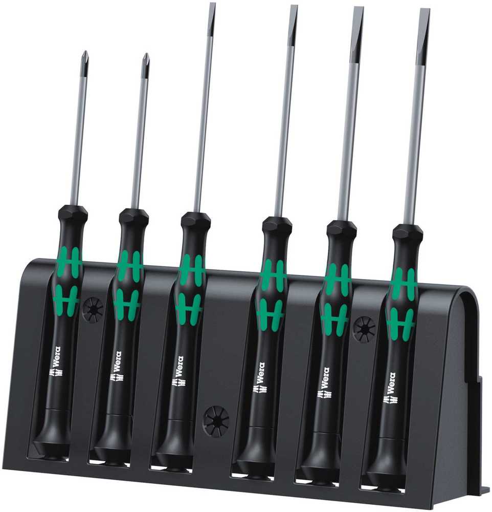 Zestaw 6 wysokiej klasy profesjonalnych wkrętaków (śrubokrętów) precyzyjnych firmy Wera. Wkrętaki precyzyjne z zestawu przeznaczone są do śrub i wkrętów z rowkiem oraz z gniazdem krzyżowym Phillips (PH). Zestaw wkrętaków precyzyjnych przyda się do prac montażowych np. w elektronice, mechanice precyzyjnej, modelarstwie itp. Każdy z wkrętaków precyzyjnych wyposażony jest w obrotowy kołpak, który umożliwia szybkie i precyzyjne pokręcanie. Dwukomponentowa rękojeść Wera Kraftform® Micro umożliwia przenoszenie wysokich momentów obrotowych. Wkrętaki precyzyjne wykonane zostały ze stali stopowej, hartowane. Końcówka robocza wkrętaków precyzyjnych jest czerniona, natomiast trzpień chromowany dla ochrony przed rdzewieniem. W zestawie wkrętaków precyzyjnych znajduje się stojaczek umożliwiający ustawienie wkrętaków np. na stole warsztatowym.