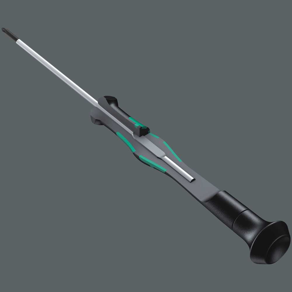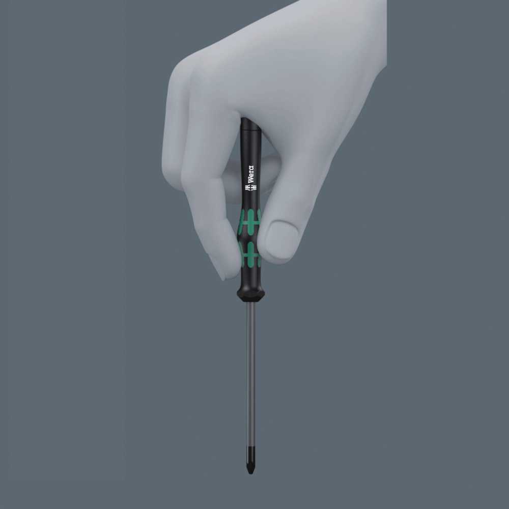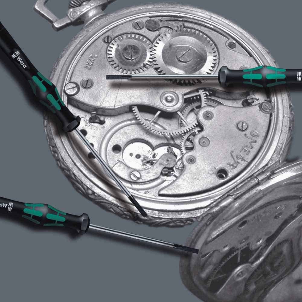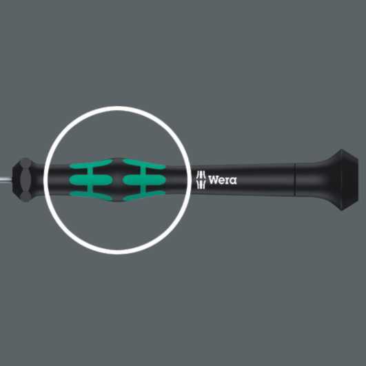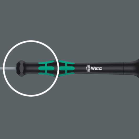Zestaw 6 wysokiej klasy profesjonalnych wkrętaków (śrubokrętów) precyzyjnych firmy Wera. Wkrętaki precyzyjne z zestawu przeznaczone są do śrub i wkrętów z rowkiem oraz z gniazdem krzyżowym Phillips (PH). Zestaw wkrętaków precyzyjnych przyda się do prac montażowych np. w elektronice, mechanice precyzyjnej, modelarstwie itp. Każdy z wkrętaków precyzyjnych wyposażony jest w obrotowy kołpak, który umożliwia szybkie i precyzyjne pokręcanie. Dwukomponentowa rękojeść Wera Kraftform® Micro umożliwia przenoszenie wysokich momentów obrotowych. Wkrętaki precyzyjne wykonane zostały ze stali stopowej, hartowane. Końcówka robocza wkrętaków precyzyjnych jest czerniona, natomiast trzpień chromowany dla ochrony przed rdzewieniem. W zestawie wkrętaków precyzyjnych znajduje się stojaczek umożliwiający ustawienie wkrętaków np. na stole warsztatowym.