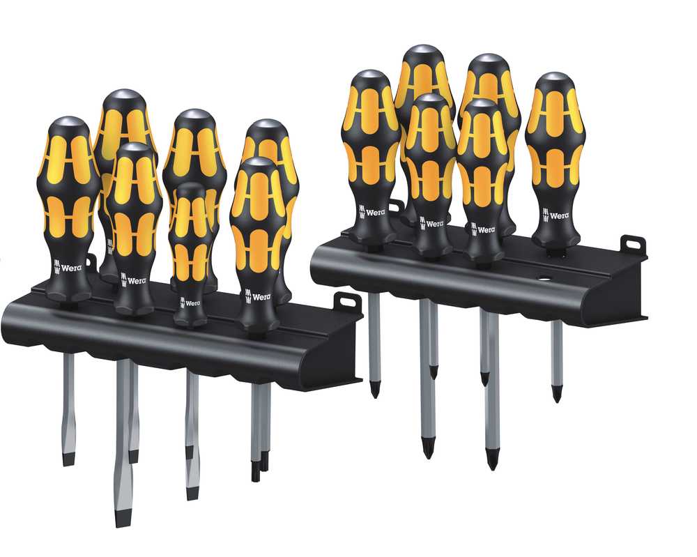 Zestaw profesjonalnych wkrętaków (śrubokrętów) do pobijania firmy Wera. Wkrętaki z zestawu wkrętaków do pobijania Wera przeznaczone są do śrub i wkrętów z nacięciem prostym (z rowkiem); gniazdem krzyżowym Phillips (PH); krzyżowym Pozidriv (PZ) oraz Torx (TX). Tego rodzaju zestaw wkrętaków do pobijania Wera na pewno zostanie doceniony przez każdego kto potrzebuje profesjonalnych narzędzi wkrętakowych do prac montażowych i serwisowych np. w warsztatach samochodowych, do cięższych prac ślusarskich itp. Zwiększony moment obrotowy zapewnia zabierak do wspomagania kluczem (poza rozmiarem 0,6x3,5x80 mm). Natomiast odporność na pęknięcia i możliwość pobijania przelotowy trzpień i kołpak. Komfortowa praca jest równie ważna jak skuteczność dlatego wkrętaki z zestawu wkrętaków do pobijania Wera mają trójkomponentową rękojeść Wera Kraftform® Plus. Wykonane zostały ze stali stopowej, chromowane. Przechowywanie wkrętaków do pobijania ułatwiają 2 wieszaki umieszczone w zestawie do zamocowania na ściance narzędziowej. Zestaw dostarczany jest w atrakcyjnym opakowaniu "na prezent".
