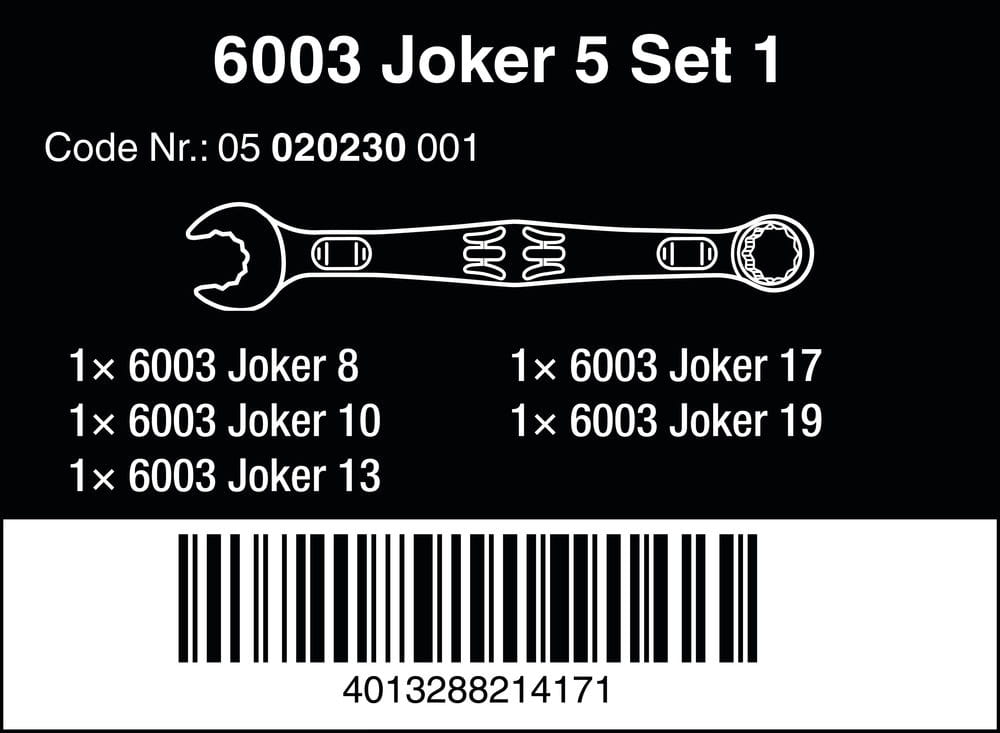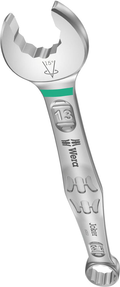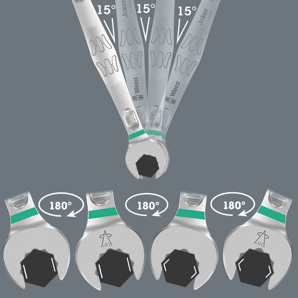 Unikatowy komplet narzędzi z przemyślaną geometrią szczęk znacznie rozszerzających zakres zastosowań w wąskich przestrzeniach. Jest to możliwe dzięki temu, że osadzenie kluczy jest co 15° na nakrętce lub łbie śruby. Jokery z serii 6003 automatycznie odnajdują odpowiedni punkt podparcia po każdym obrocie klucza. Smukła, a jednocześnie wytrzymała strona oczkowa jest odchylona pod kątem 15° w stosunku do osi narzędzia. Wysokiej jakości powierzchnia kluczy zapewnia bardzo dobrą i długotrwałą ochronę antykorozyjną. System wyszukiwania narzędzi Wera „Take it easy“ to system oznaczania kolorystycznego kluczy według rozmiaru. Etui na klucze Joker 6003 nadają się do montażu na ścianie, półce, wózku warsztatowym i dzięki rzepom są kompatybilne z systemem Wera 2go. Wysoka i niepowtarzalna wytrzymałość kluczy to najlepsza na świecie funkcjonalność i wszechstronność zastosowań.