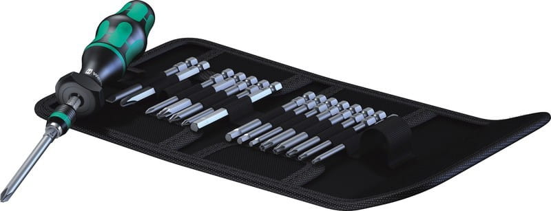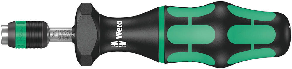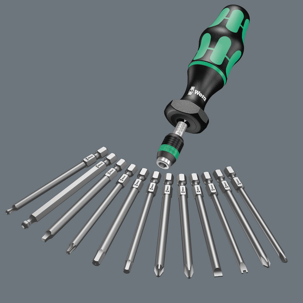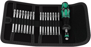 Zestaw profesjonalnych narzędzi wkrętakowych (wkrętak dynamometryczny z uchwytem + 16 końcówek wkrętakowych) serii Kraftform Kompakt firmy Wera. Końcówki z zestawu przeznaczone są do montażu elementów złącznych z gniazdem krzyżowym Phillips (PH) i Pozidriv (PZ), Torx z trzpieniem (Resis-Torx), sześciokątnym (imbus) lub nacięciem prostym (z rowkiem). Ten profesjonalny zestaw narzędzi wkrętakowych jest przydatny do precyzyjnych prac montażowych i serwisowych wymagających kontrolowanej siły dokręcania. Najważniejsze cechy wkrętaka dynamometrycznego z zestawu Kraftform Kompakt 60 Torque: